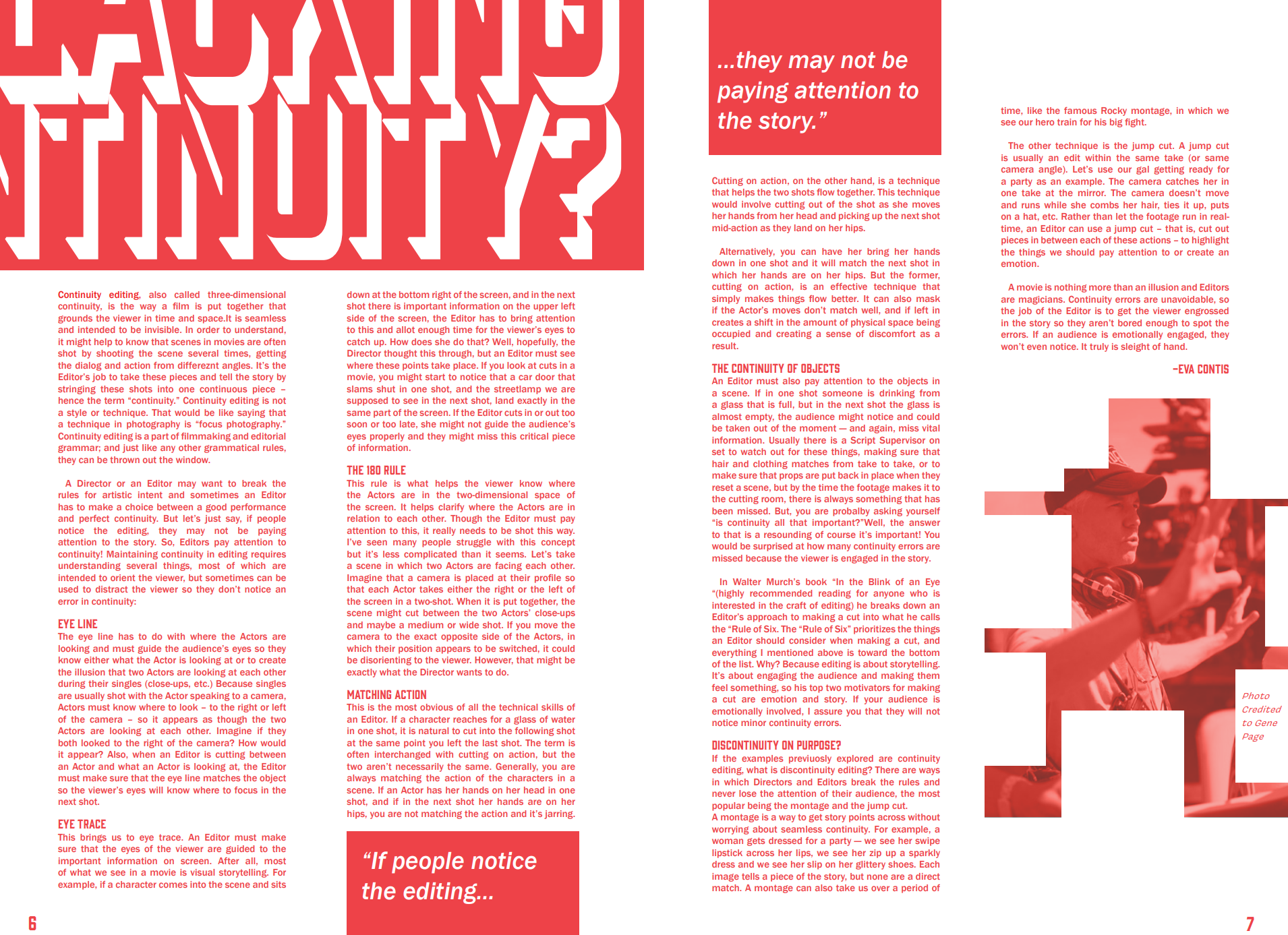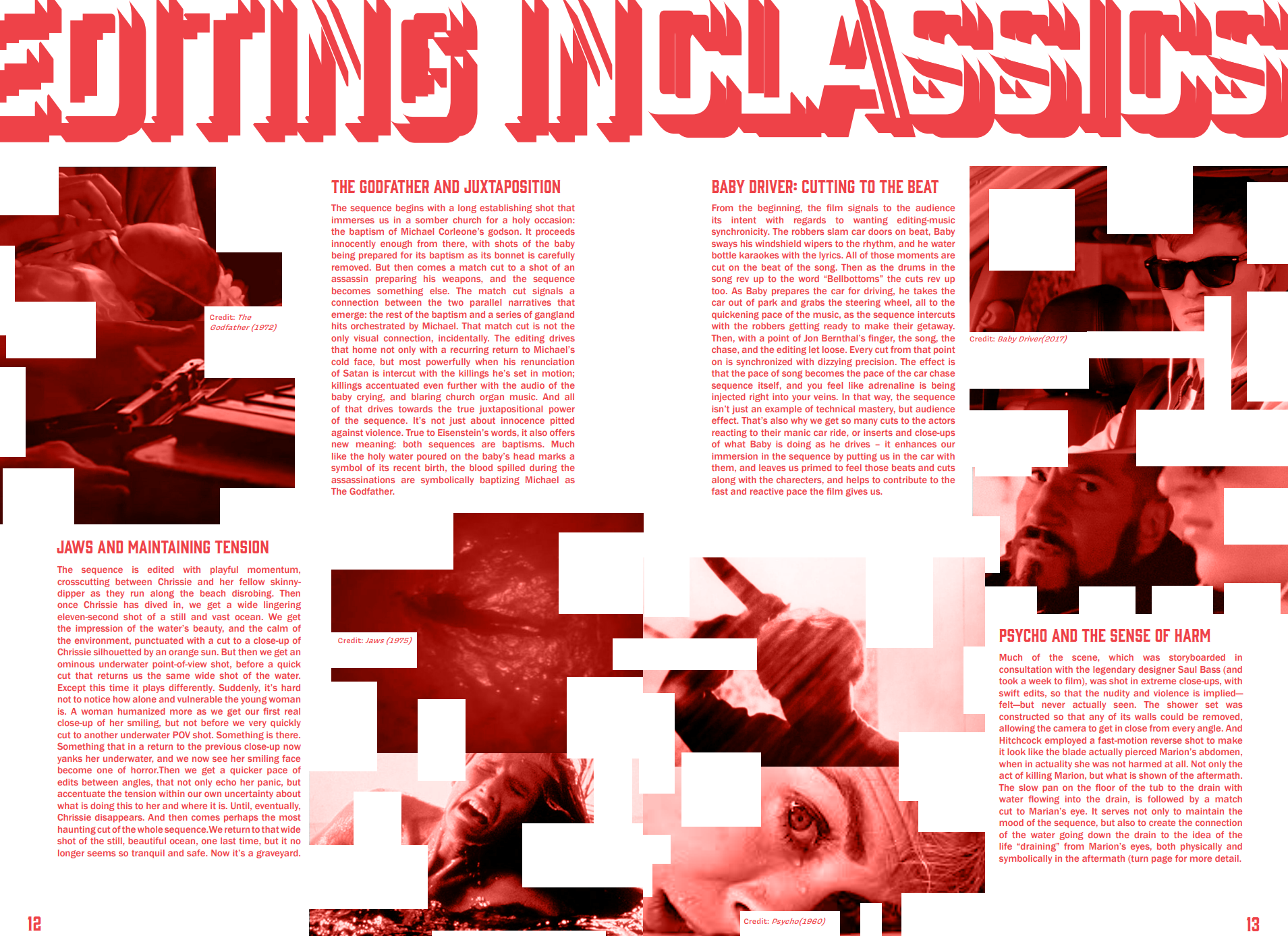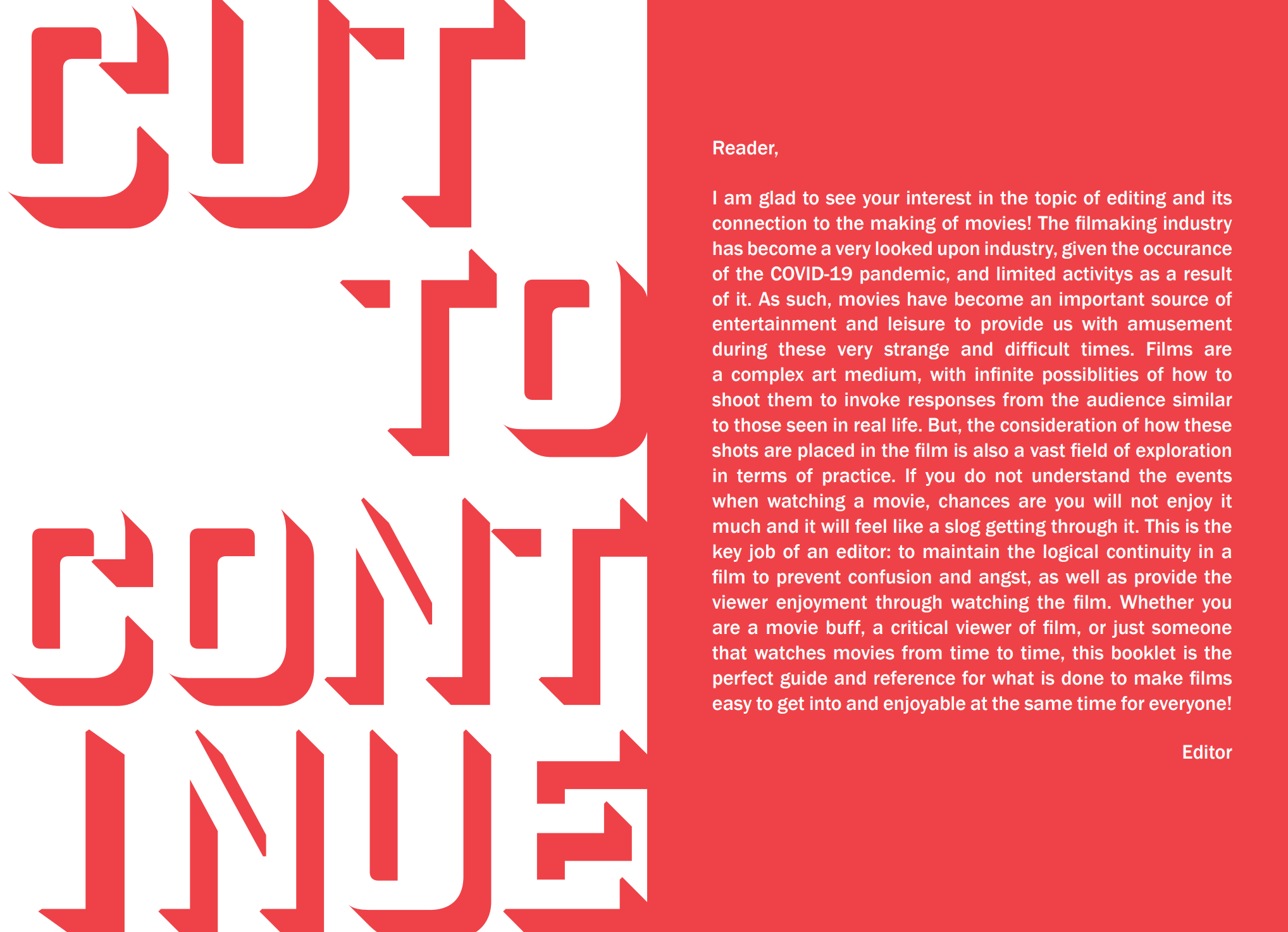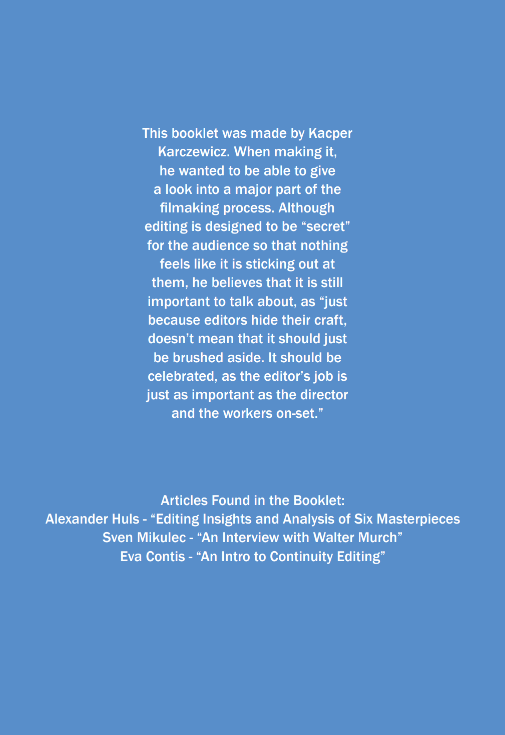 I was tasked here with creating a zine of a topic of my choosing. So, I chose to do one that focused around editing in movies, seeing as I beleive that it is an important aspect in the movie industry or in the online realm given that content always needs to be trimmed or cut for the full enjoyment of the viewer. I included a few sources in order to act as the main articles for the zine, as well as made a few of my own sections including the Letter from the Editor, Editing in Classics and Sequence to Frequent.
