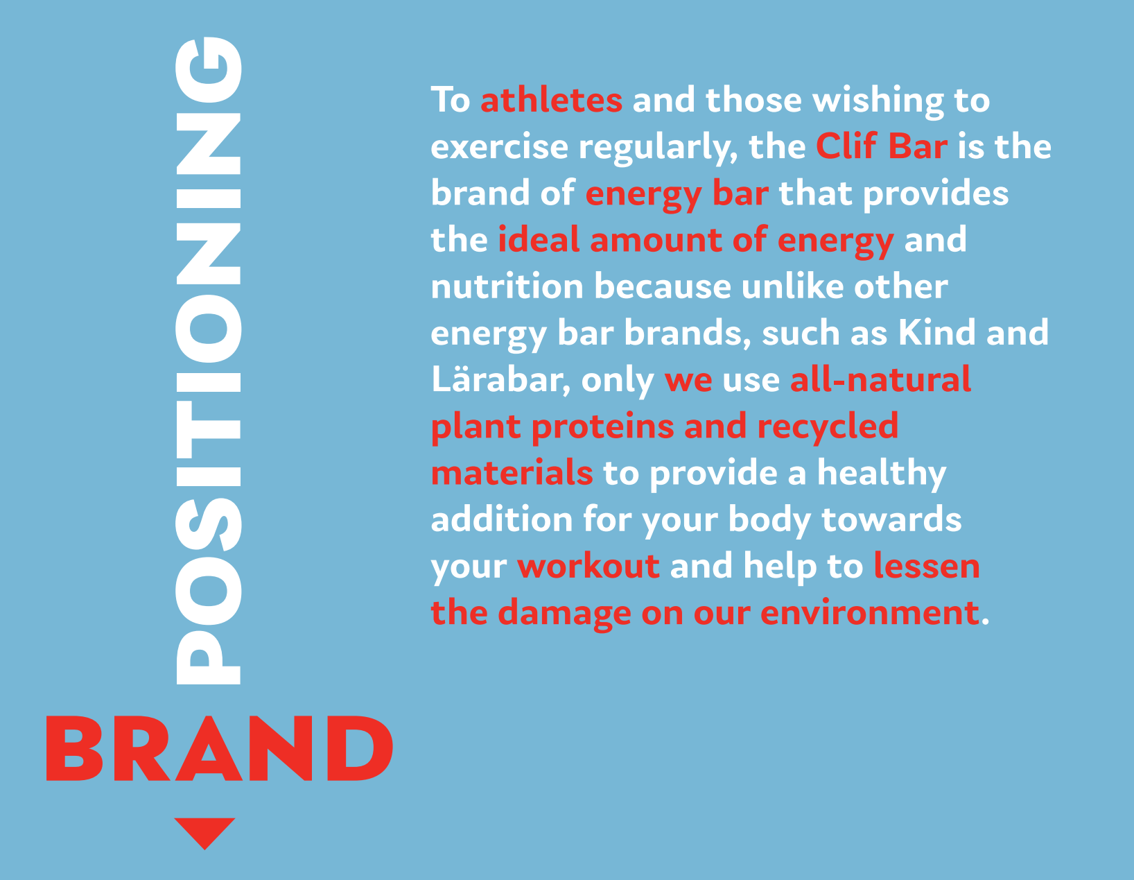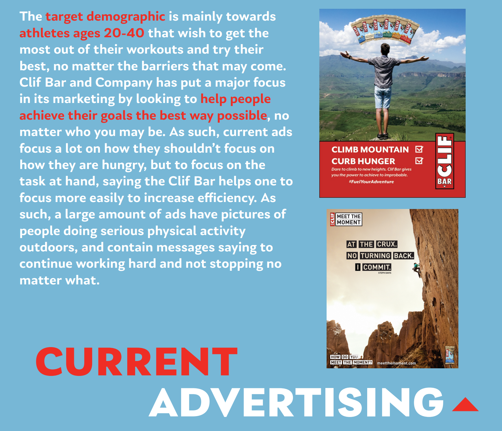 Here, I was asked to pick a Fast Moving Consumer Good (FMCG for short) and create a small scale ad campaign as well as create a new tagline for the campaign that would fit the approach that I took for the product. I chose the CLIF Energy Bar, and decided for my tagline to be “Get Past Your CLIF”, to further push the goal of CLIF Bar & Company to help athletes in their workout by providing them the source of energy to get past their challenge, or “cliff”.