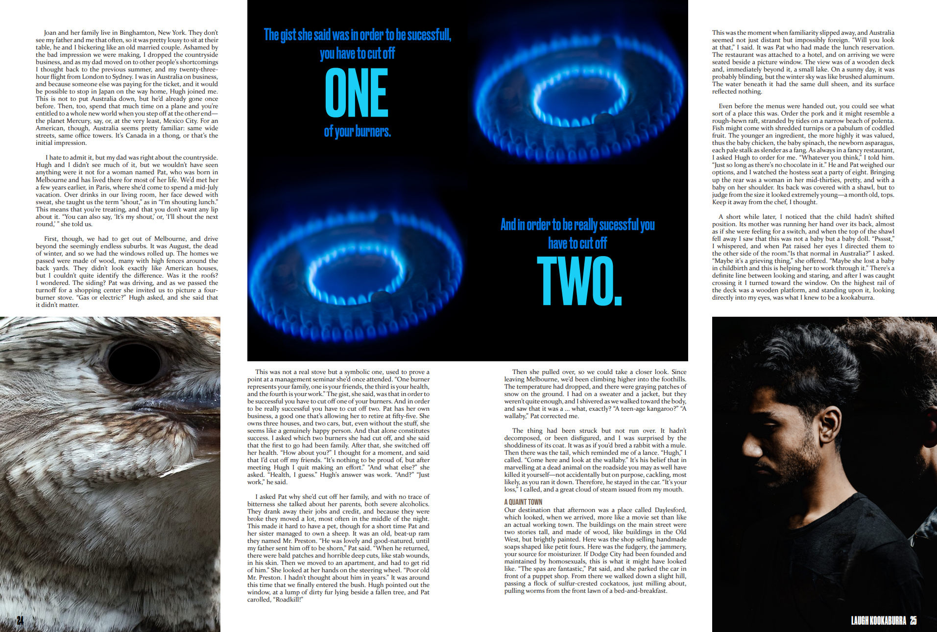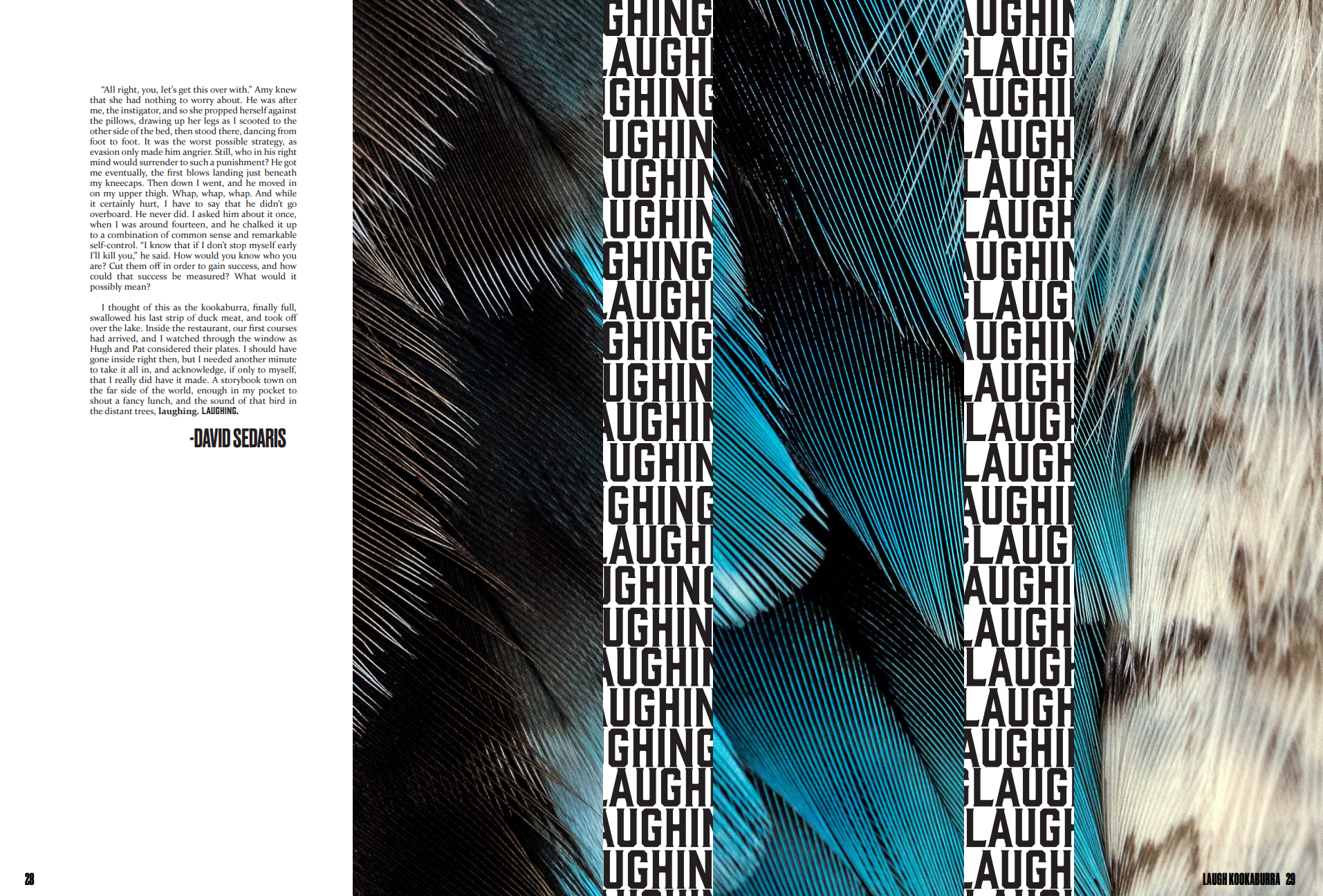 Here, I was given an article and had to create a magazine spread for the story that followed the standards of how WIRED Magazine would set up the story. The article itself, written by David Sedaris, is an introspective story that focuses around a vacation he took in Australia, and how seeing some kookaburras there unearthed a memory of child abuse by his father, and how it affects him in the present. Given the serious content of the story itself, I decided to create imagery that echoes the more sombre mood of the story, while also making specific references to moments in the story.